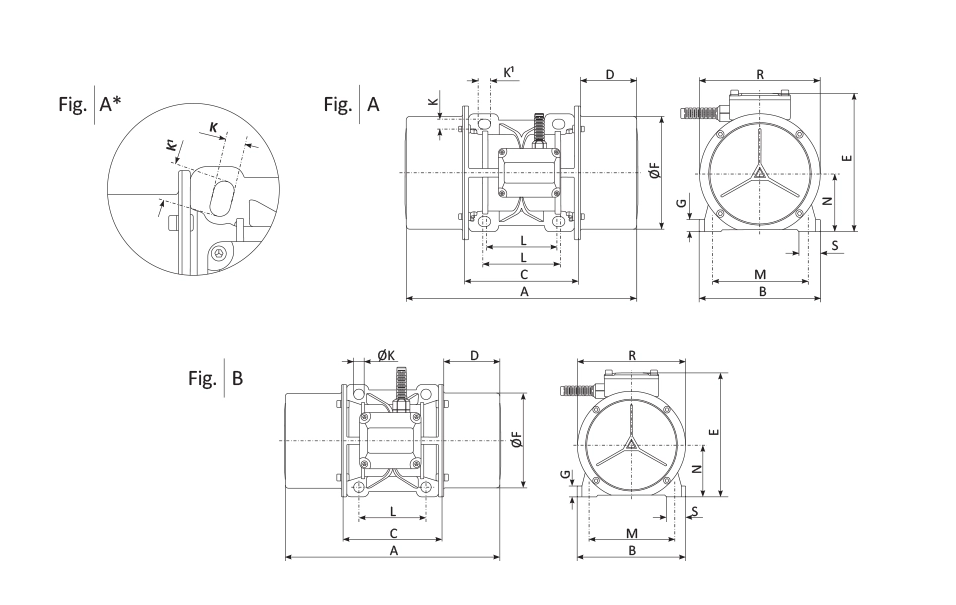 Model / Type | Gövde / Size | Fig | A | B | C | D | E | ØF | R | L | M | ØK | ØK | K¹ | G | S | N |