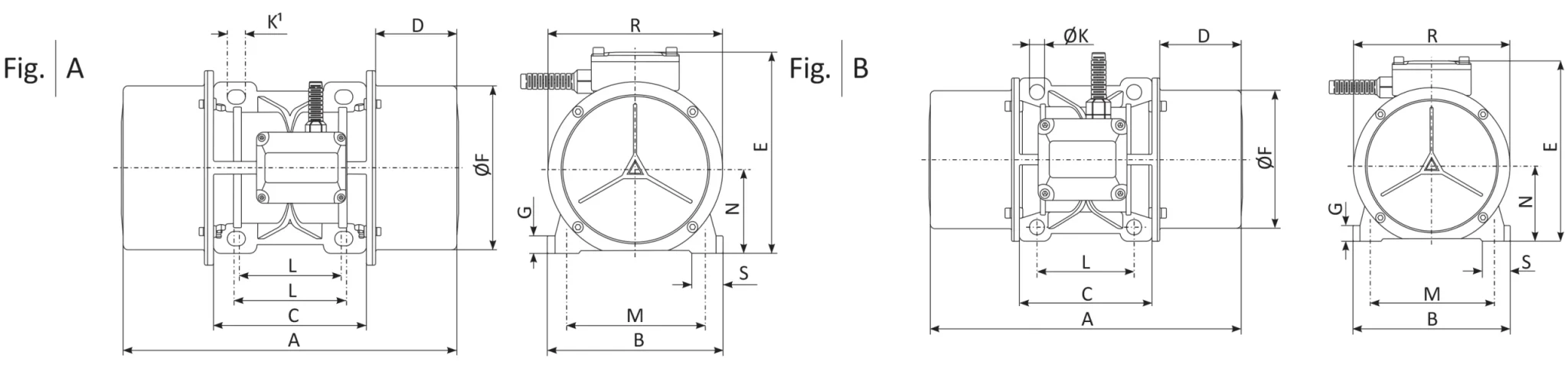 Model / Type | Gövde / Size | Fig | A | B | C | D | E | ØF | R | L | M | ØK | ØK | K¹ | G | S | N |