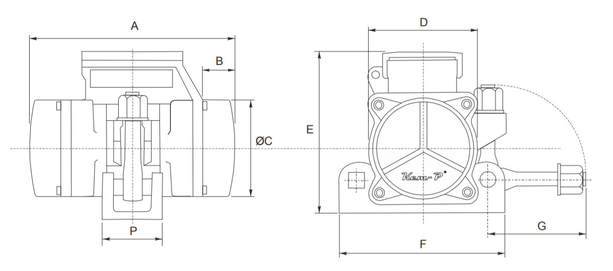 Type | Size | A | B | ØC | D | E | F | G | P |