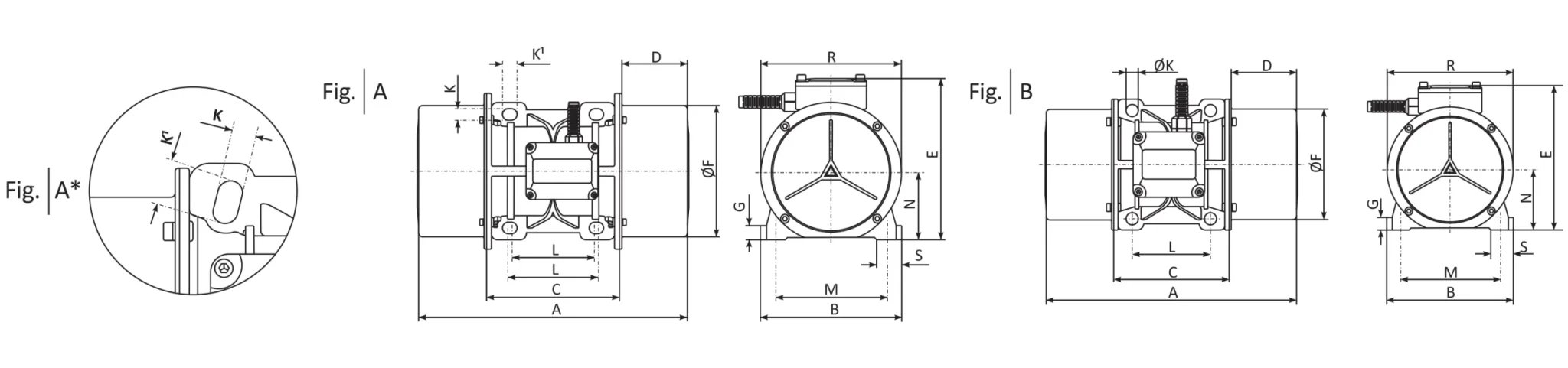 | Model / Type | Gövde Size | Fig | A | B | C | D | E | ØF | R | L | M | ØK | ØK | K¹ | G | S | N |